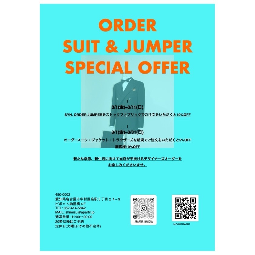 apartir 1周年第二弾フェアの開催。•3/1-3/11 Syn.ORDER JUMPERショップファブリックでオーダーを頂くと10%オフとさせて頂きます!•3/1-3/31 àpartir ORDER PRODUCTオーダースーツ、ジャケット、トラウザーズを期間中にお仕立てを頂くと新規のお客様5%オフ、顧客様10%オフにて提供させて頂きます!春夏に向けて、オーダーをお楽しみくださいませ。450-0002愛知県名古屋市中村区名駅5丁目24−9ピボット納屋橋4FTEL: 052-414-5842MAIL: shimizu@apartir.jp通常営業 :11:00〜20:0020時以降はご予約定休日:火曜日(その他不定休)HP:https://www.apartir.jp